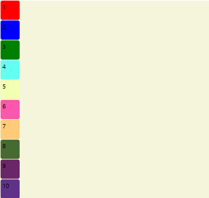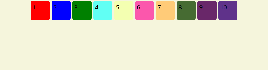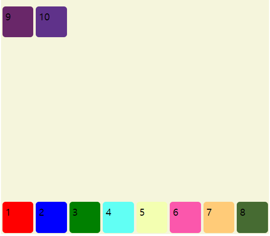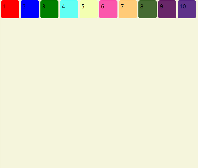 박스 요소 사이 동일한 공간이 배치되지만 양쪽 끝 박스(1번과 10번)는 좌우 맨 끝에 배치가 된