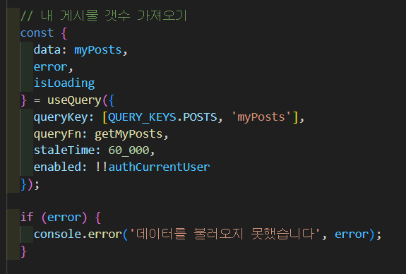 또한 react-quert의 장점 중 하나가 error와 loading 처리를 한 번에 할 수 있다는 것이다.