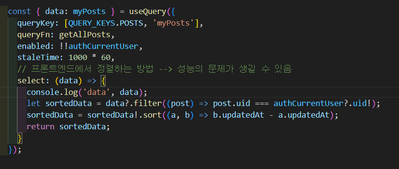 정렬하는 곳에서 데이터를 다 가져와서 sort로 정렬하는 것은 프론트엔드에서 너무나 부담스럽고, 비효율적, 서버 성능 저하 문제가 발생한다는 것이었다.