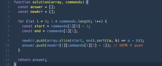 배열 array, [i, j, k]를 원소로 가진 2차원 배열 commands가 매개변수로 주어질 때, commands의 모든 원소에 대해 앞서 설명한 연산을 적용했을 때 나온 결과를 배열에 담아 return 하도록 solution 함수를 작성해주세요.