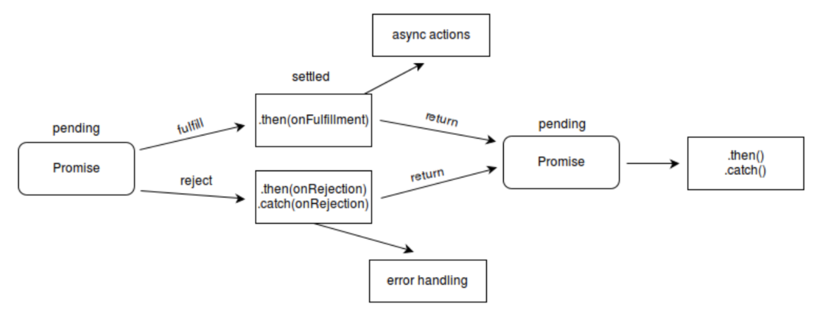 비동기 처리가 완료 되지 않았다면 Pending, 완료 되었다면 Fulfilled, 실패하거나 오류가 발생하였다면 Rejected 상태를 갖는다.