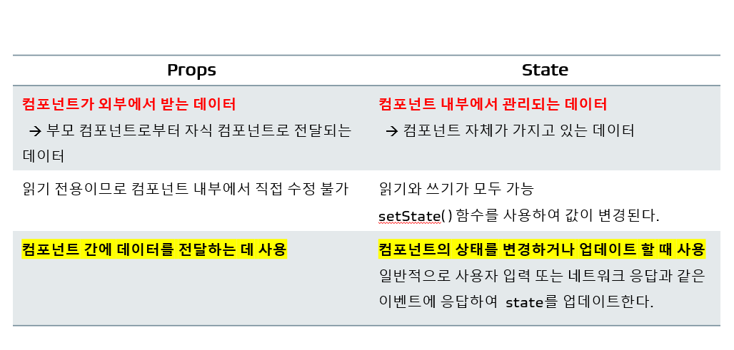 Props와 State는 모두 컴포넌트의 데이터를 다루는 데 사용하며 일반 Javascript 객체이다