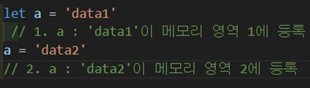 3. 메모리 영역에서 ‘data2’는 ‘data1’을 대체하는 것이 아니라 새로운 영역에 할당