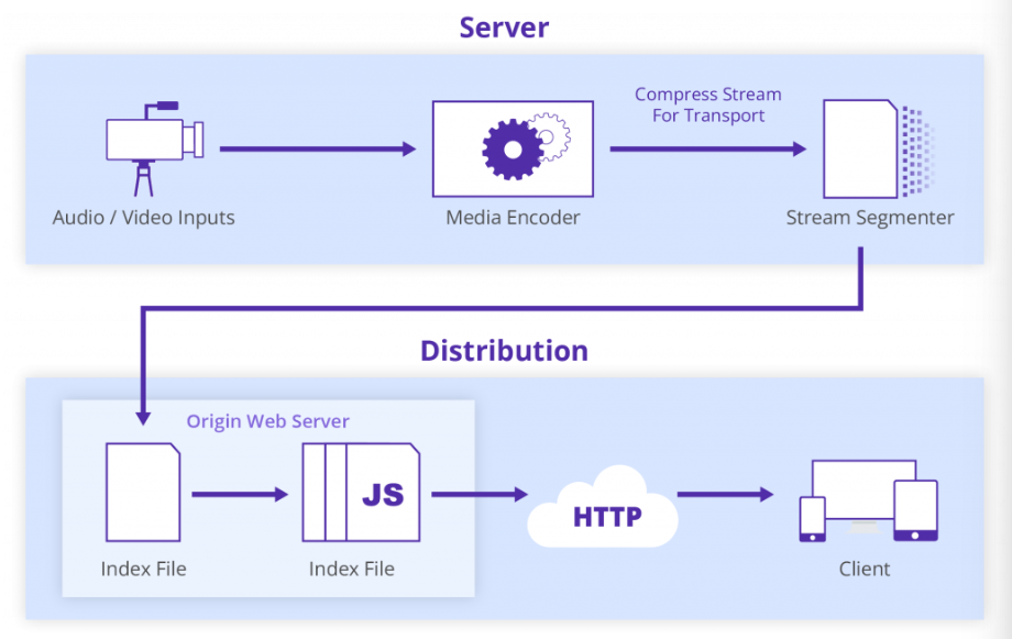 1. 서버: HLS 스트리밍은 미디어 파일이 저장된 서버(주문형 스트리밍의 경우)나 스트리밍이 제작된 서버(라이브 스트리밍의 경우)에서 시작된다. HLS는 HTTP에 기반하기 때문에 모든 일반 웹 서버에서 스트리밍을 시작할 수 있다.