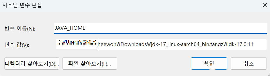 변수 값 : jdk를 다운받은 폴더 경로를 복사하여 붙여넣기