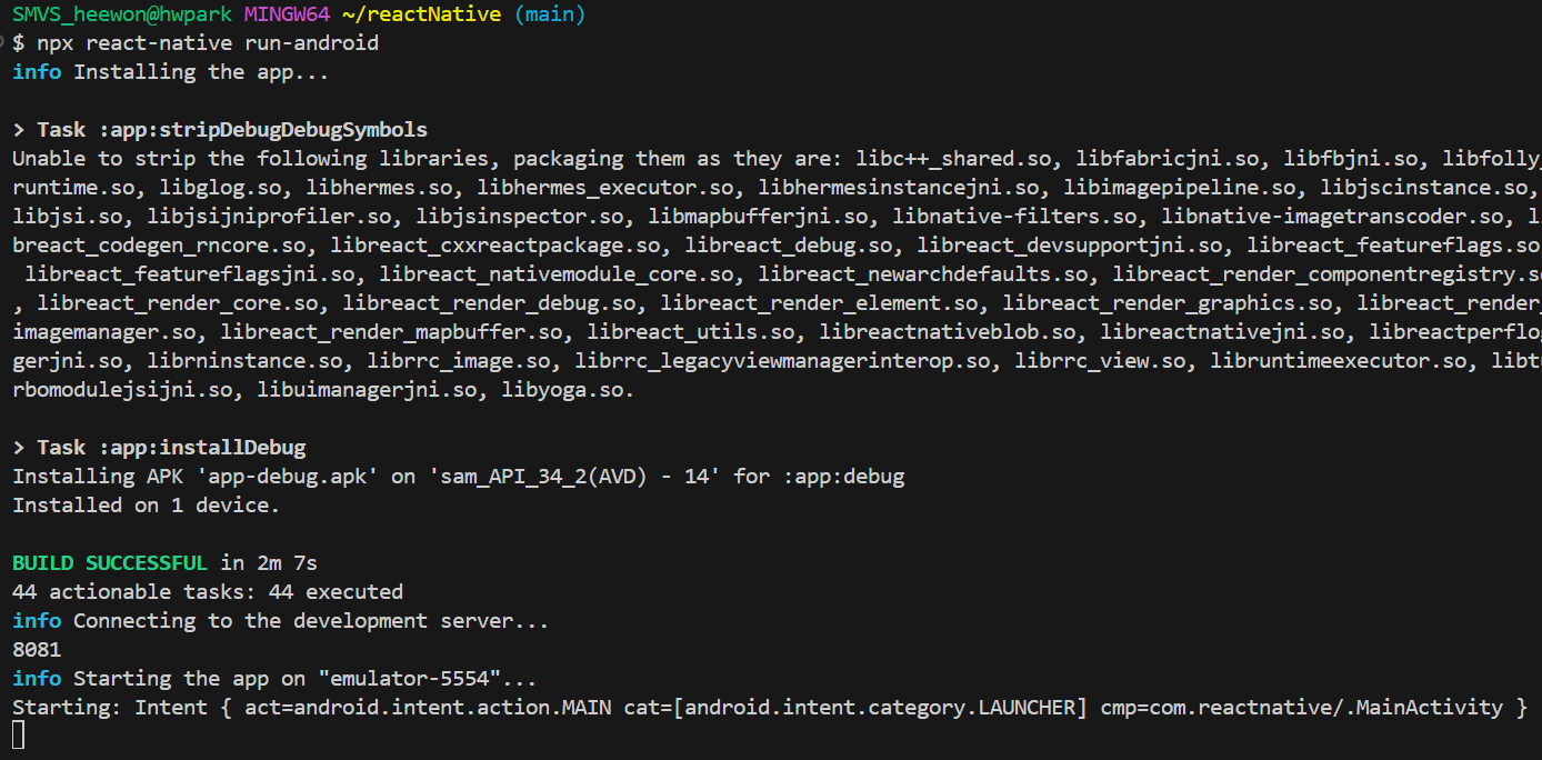 어느 순간 npx react-native run-android를 다시 실행했더니 성공했다