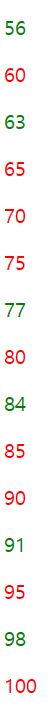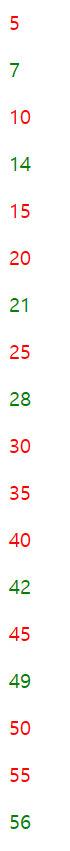 // 1~100까지 5의 배수는 빨간색 글자, 7의 배수는 초록색 글자,