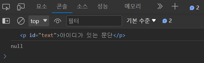 console.log(document.getElementById("p")) // null 값이 나왔다(id선택자가 아니기 때문에)