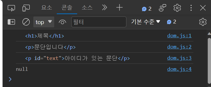 문서 내 요소(Element)를 반환한다. 일치하는 요소가 없으면 '없다'라는 의미의 null 데이터를 반환한다.