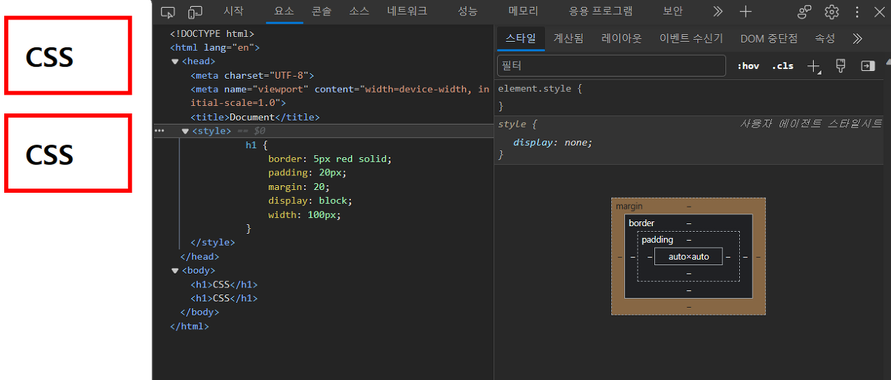 <h1>CSS</h1> 를 추가했더니 테두리와 테두리 사이에 간격이 생겼다