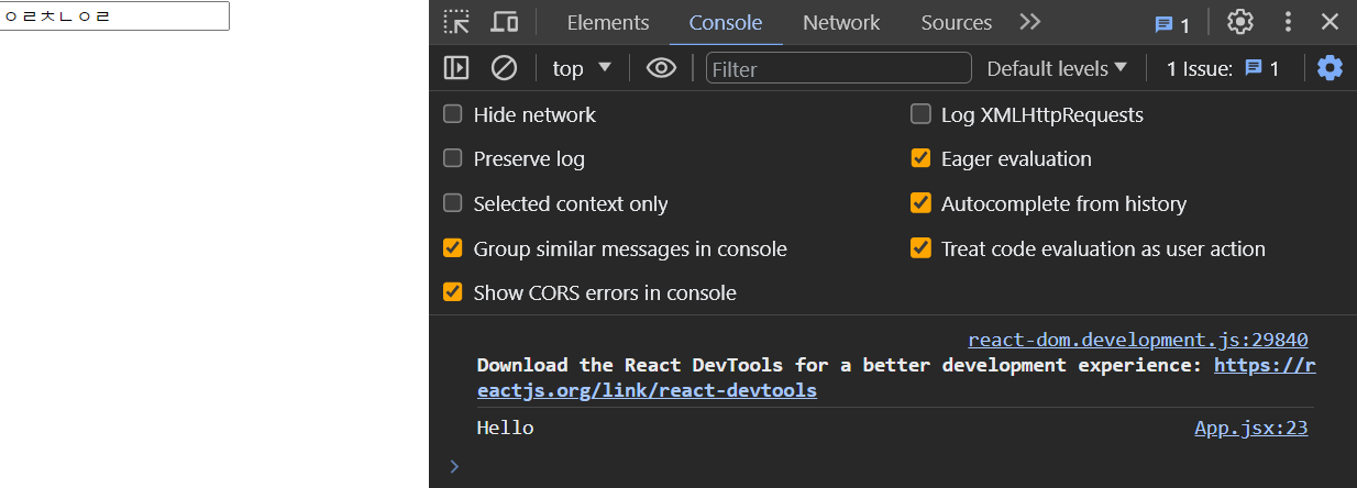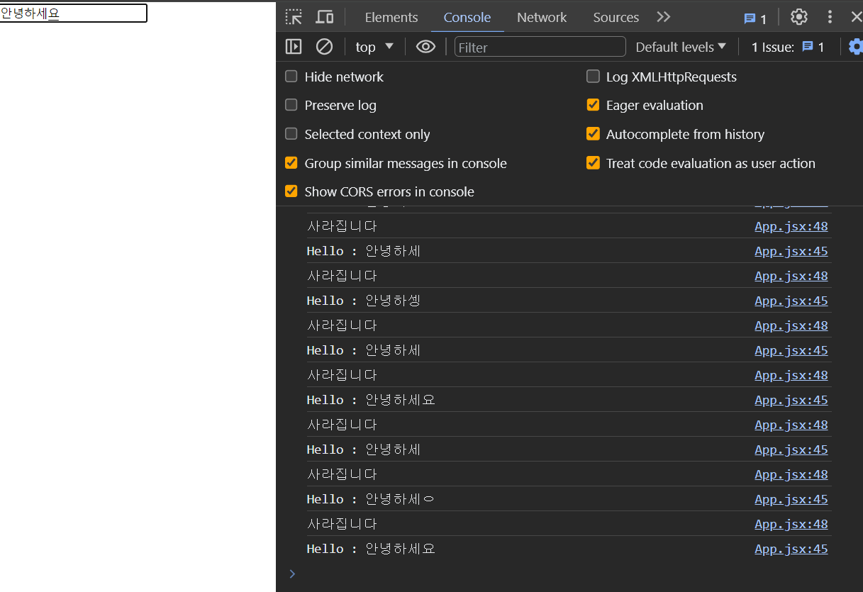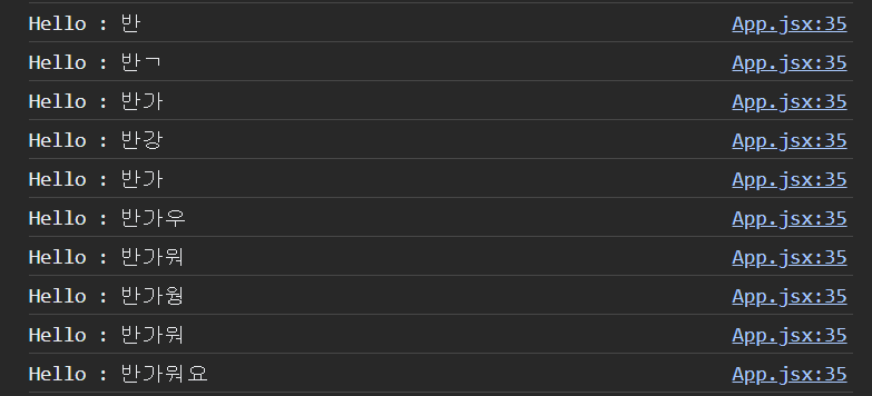 input 창을 만들고 값을 입력하여 콘솔에 '반가워요'를 입력해 봤더니