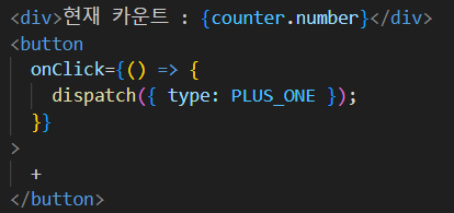 마우스를 클릭했을 때 dispatch(action)이 실행되고, ( )안에 있는 액션객체가 리듀서로 전달된다.