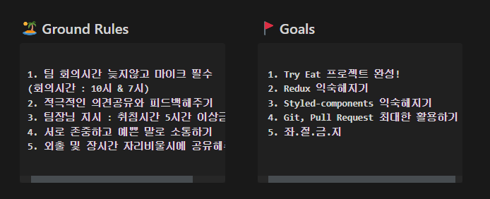 프로젝트 시작 전 팀원들과의 규칙이나 목표를 적었었는데 규칙도 다 지켜졌고 목표에선 좌.절.금.지 항목이 조금 지켜지지 않았지만 전반적으로 다 해냈다! 특히 취침시간 5시간은 굳은 의지를 표현하는 장난반 진담반으로 적어놨는데 이게 실제로