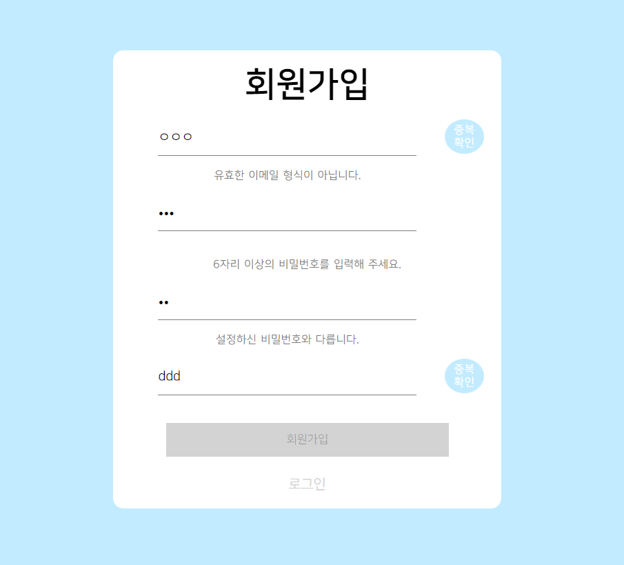 - 로그인 및 회원가입 입력시 실시간 유효성 검사