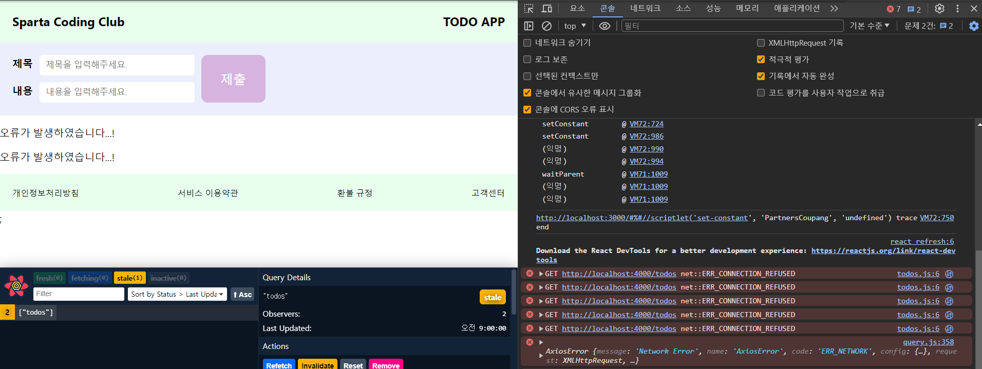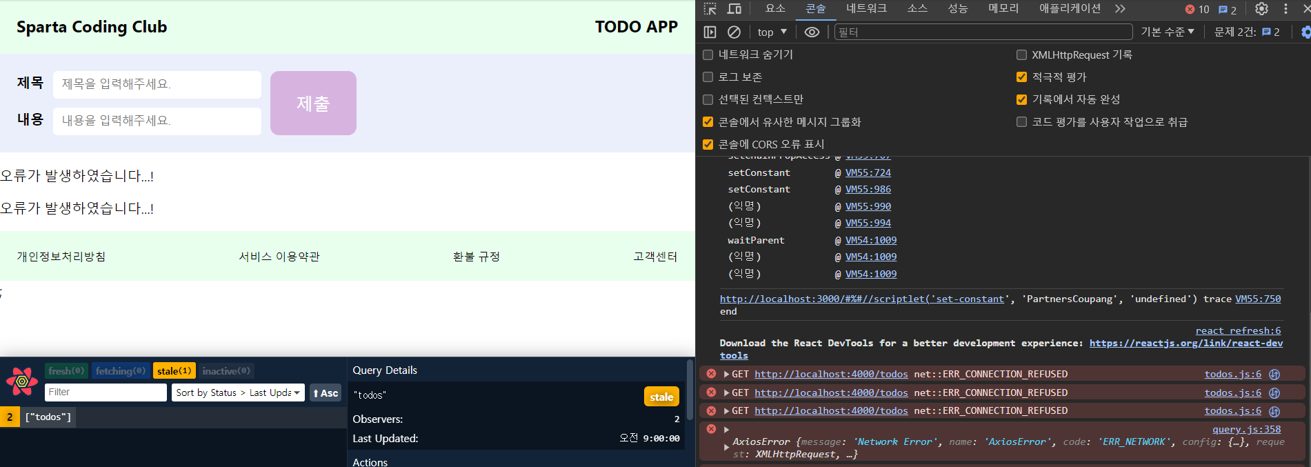 이후에 콘솔창을 보면 시도를 세 번 한 후에 에러가 발생되는 것을 볼 수 있다